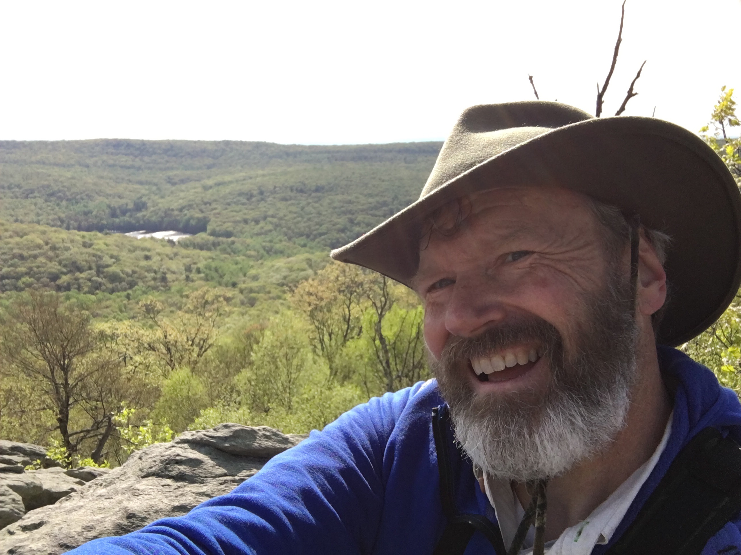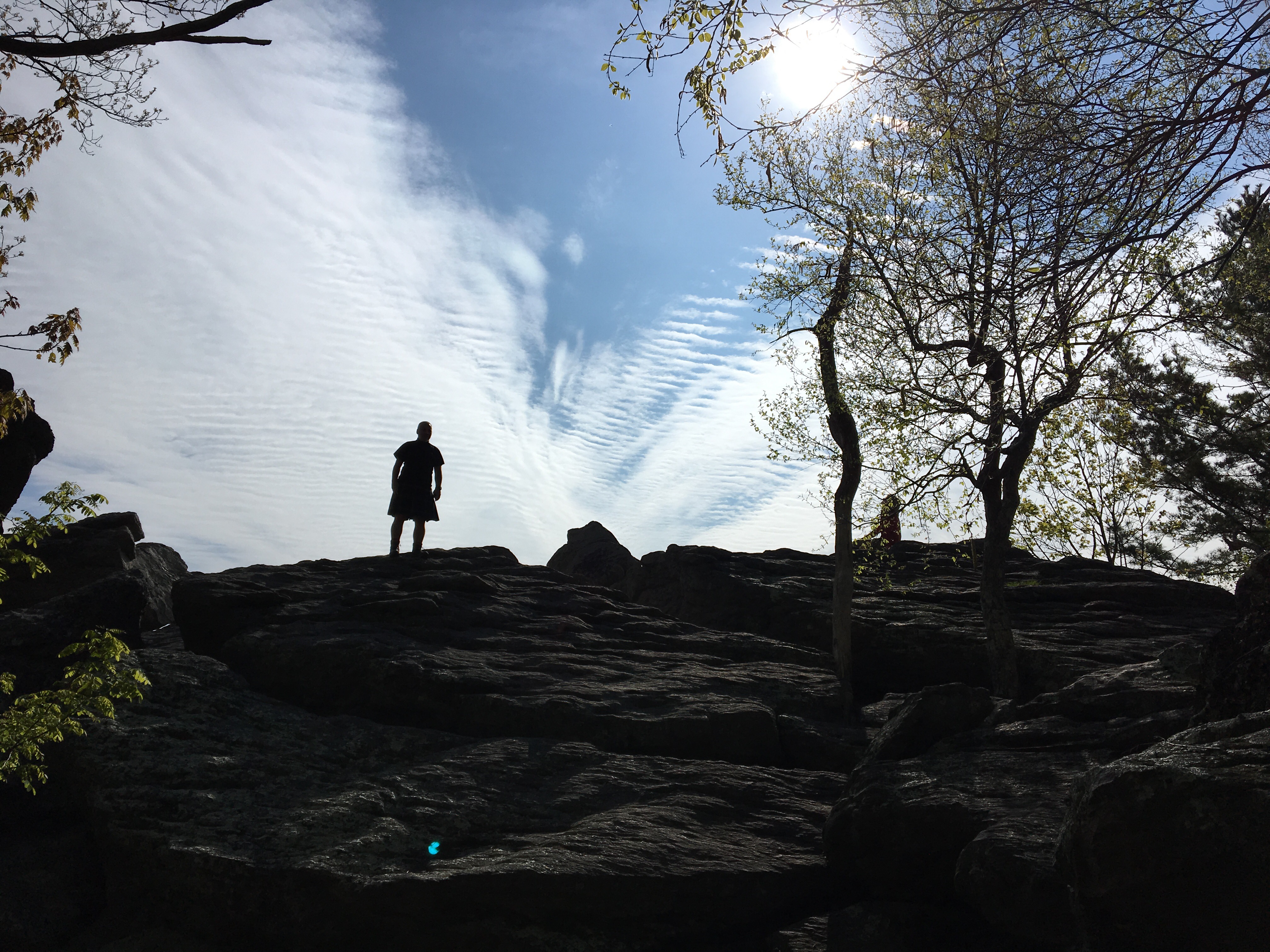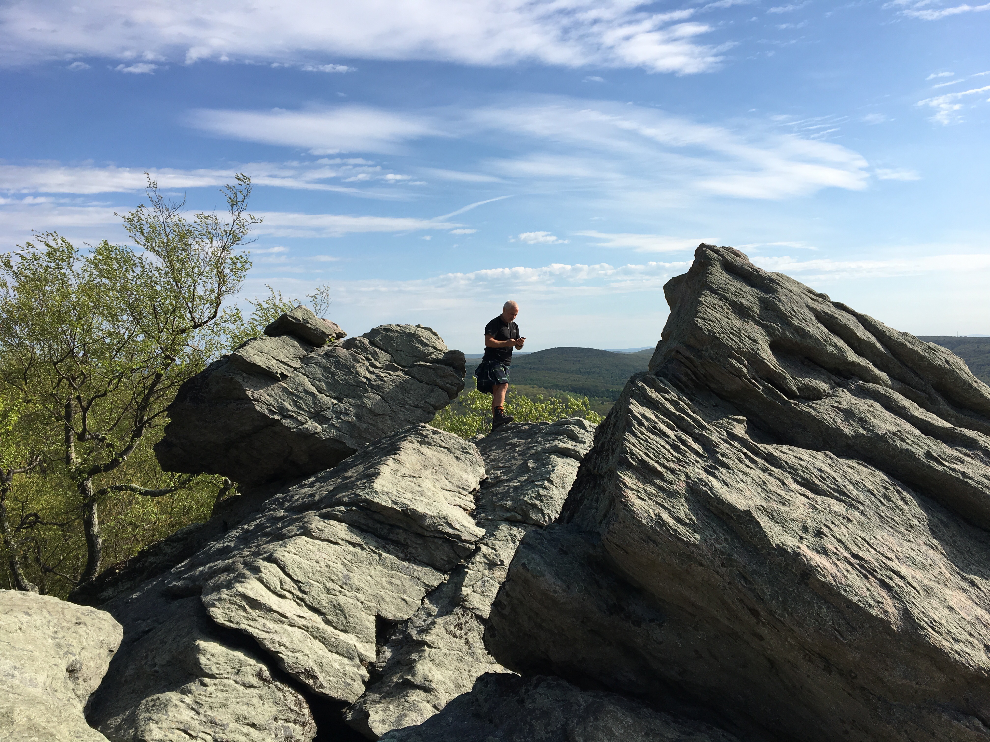 And again, time and/or distances seemed distorted. The first hour or so this morning seemed compressed: there was supposed to be a picnic area with a water tap at .5 miles of which I came upon immediately, and the Tumble Run shelter, which was supposed to be 2-3 miles on, came up fast, too. There I met Scotty (now called ‘Highlander’) cleaning up after breakfast, as well as flip-flopper ‘Meeko’. Off on a tent pad away from the shelter was the girl from Pen Mar Park, Jackie. I chatted for a few minutes, then headed off to find the Chimney Rocks overlook. Ah, this is where the trail gains some height; it took a real push to get up. Highlander caught me up, and together we blue blazed to the cliffs. A reward for that uphill climb!