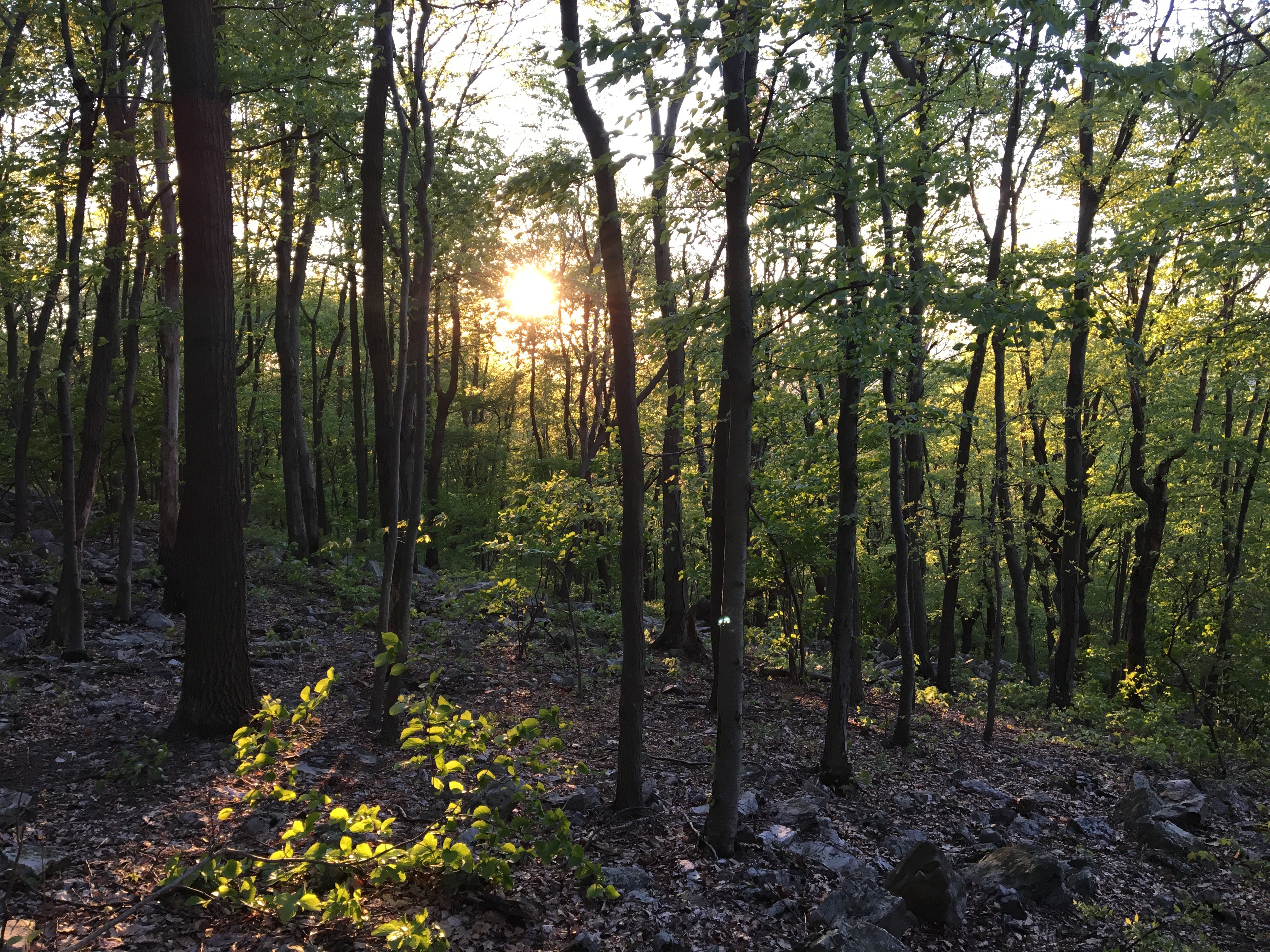 As the sun was shining into my hammock, and I could see it nearing the horizon, I remembered that this shelter is supposed to have an overlook, and I thought that might make for a great photo opportunity, I jumped out of the hammock to find the overlook. While moving more quickly than was prudent, I caught my toe on one of the infamous rocks and took a true header. I landed square on my chest and even hit my head on the ground; my phone went flying and it took me some time to find it. Apparently I lost my little glasses, too. Luckily, I have more than one pair of glasses!