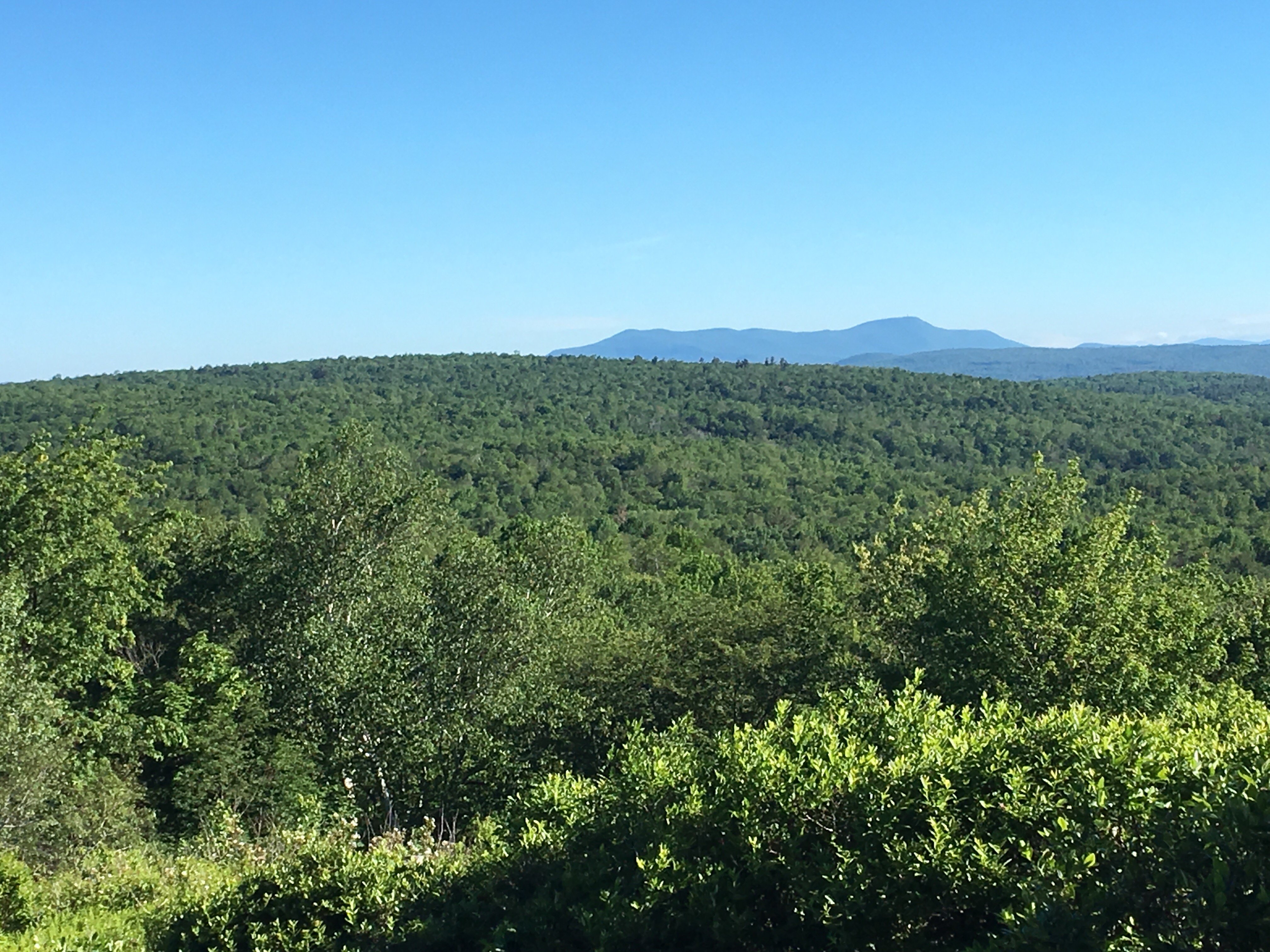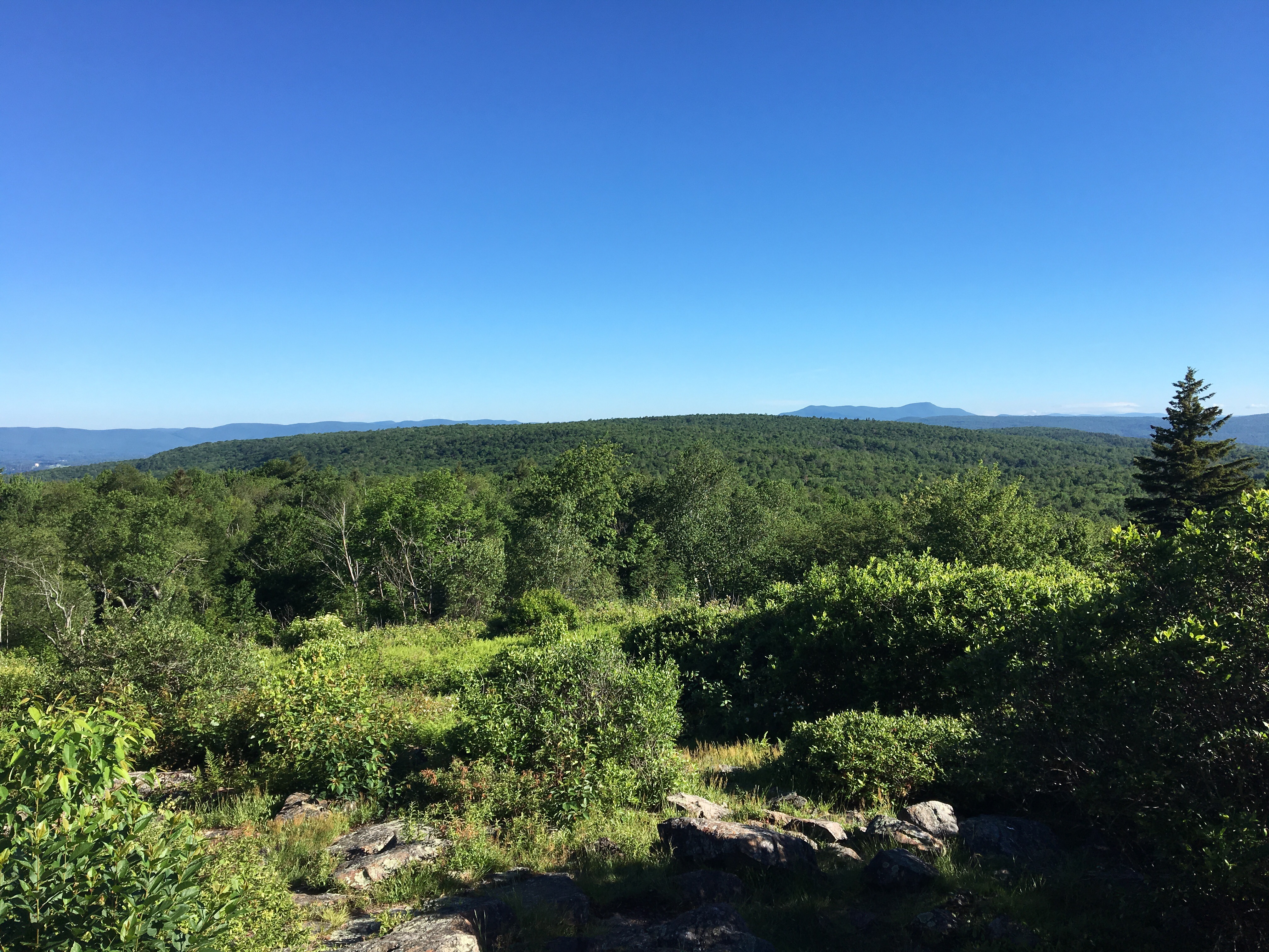 The trail was the normal green tunnel, with moderate ups and downs; maybe a little more intense than yesterday. The first notable landmark was Warner Hill, with a beautiful view north, including an amazing look at Mt. Greylock.