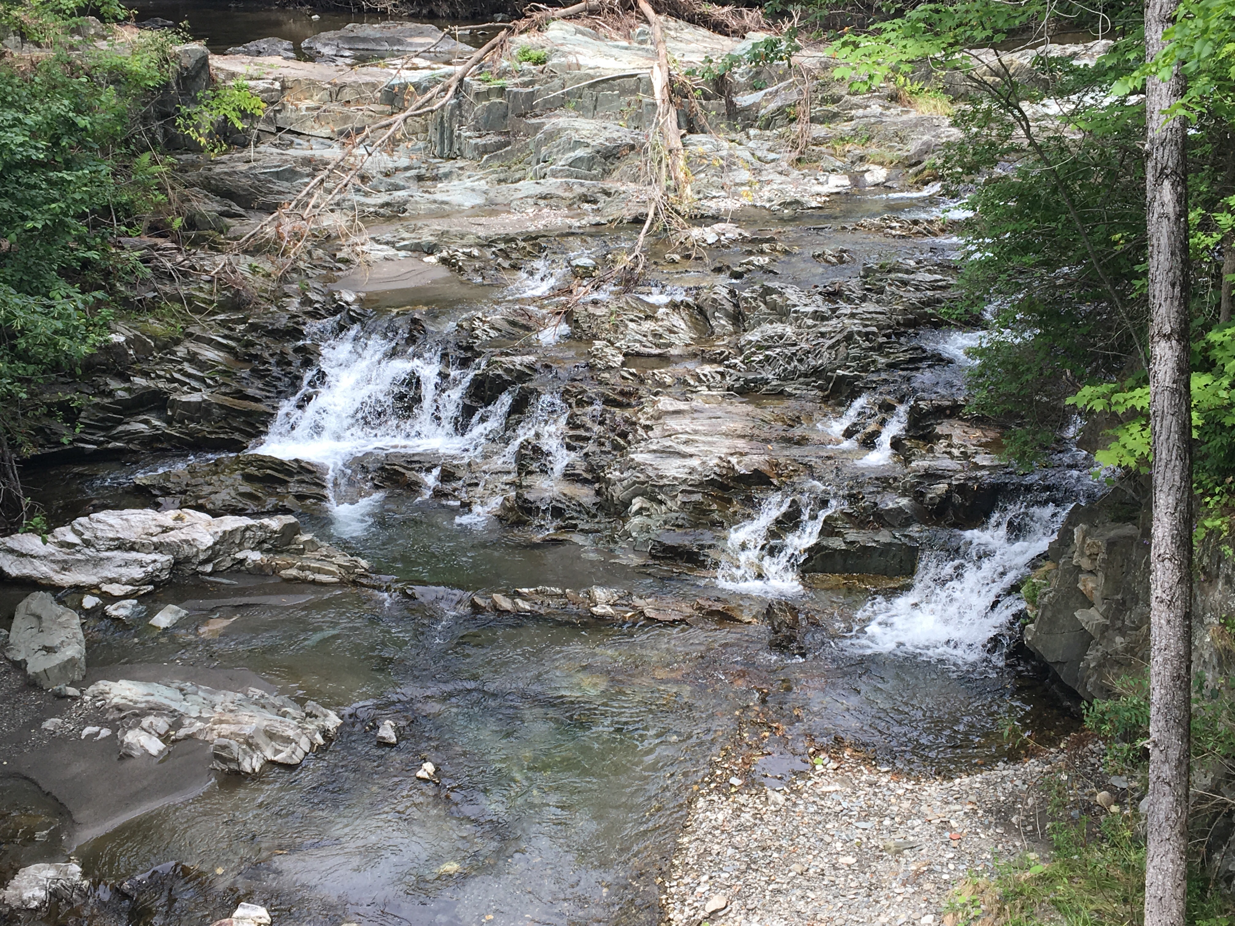 The road walk to the Connecticut River and the NH border is another 3+ miles, and the pavement is rough on the feet. It crossed a bridge going over a brook with a cool waterfall.