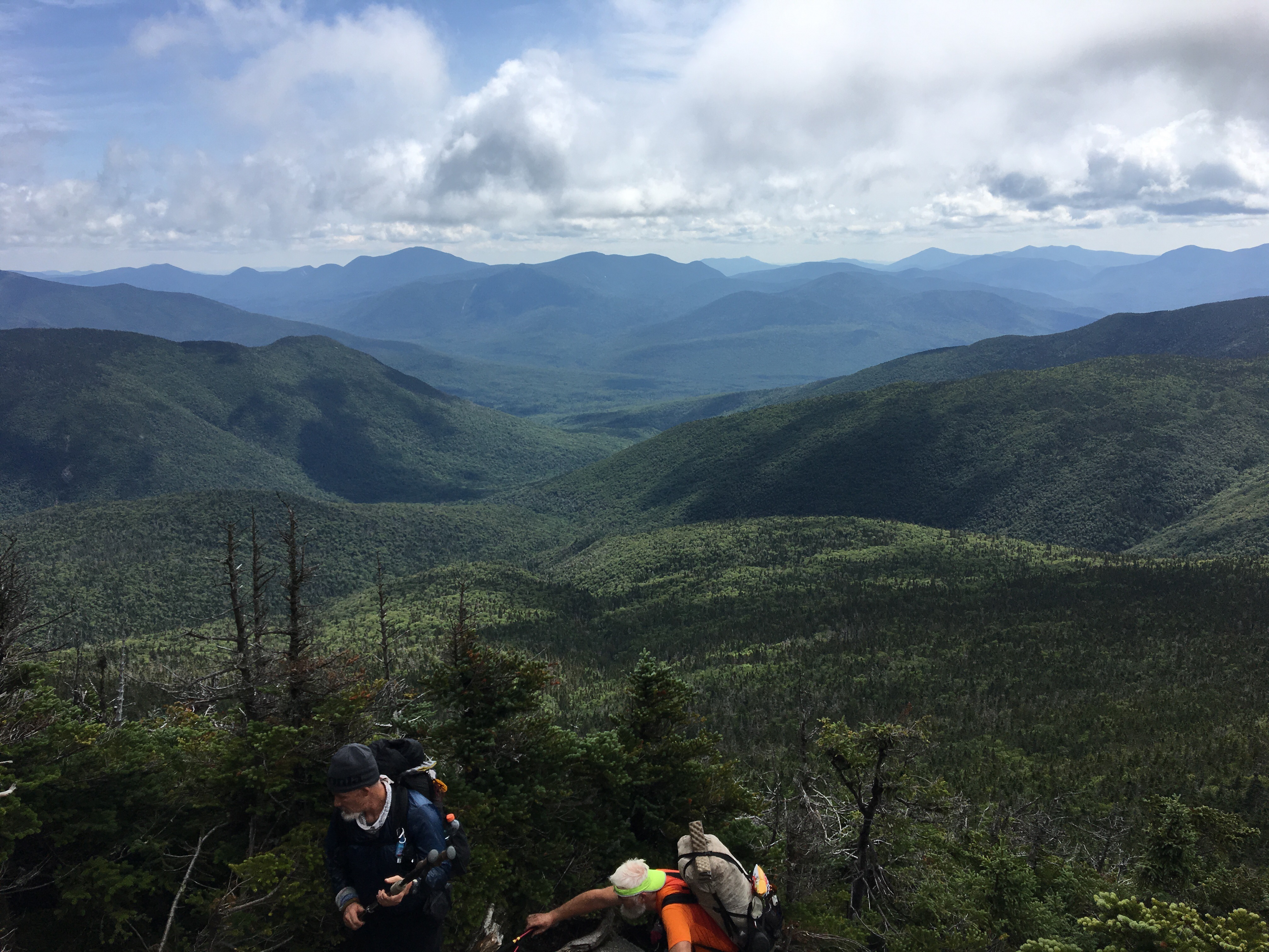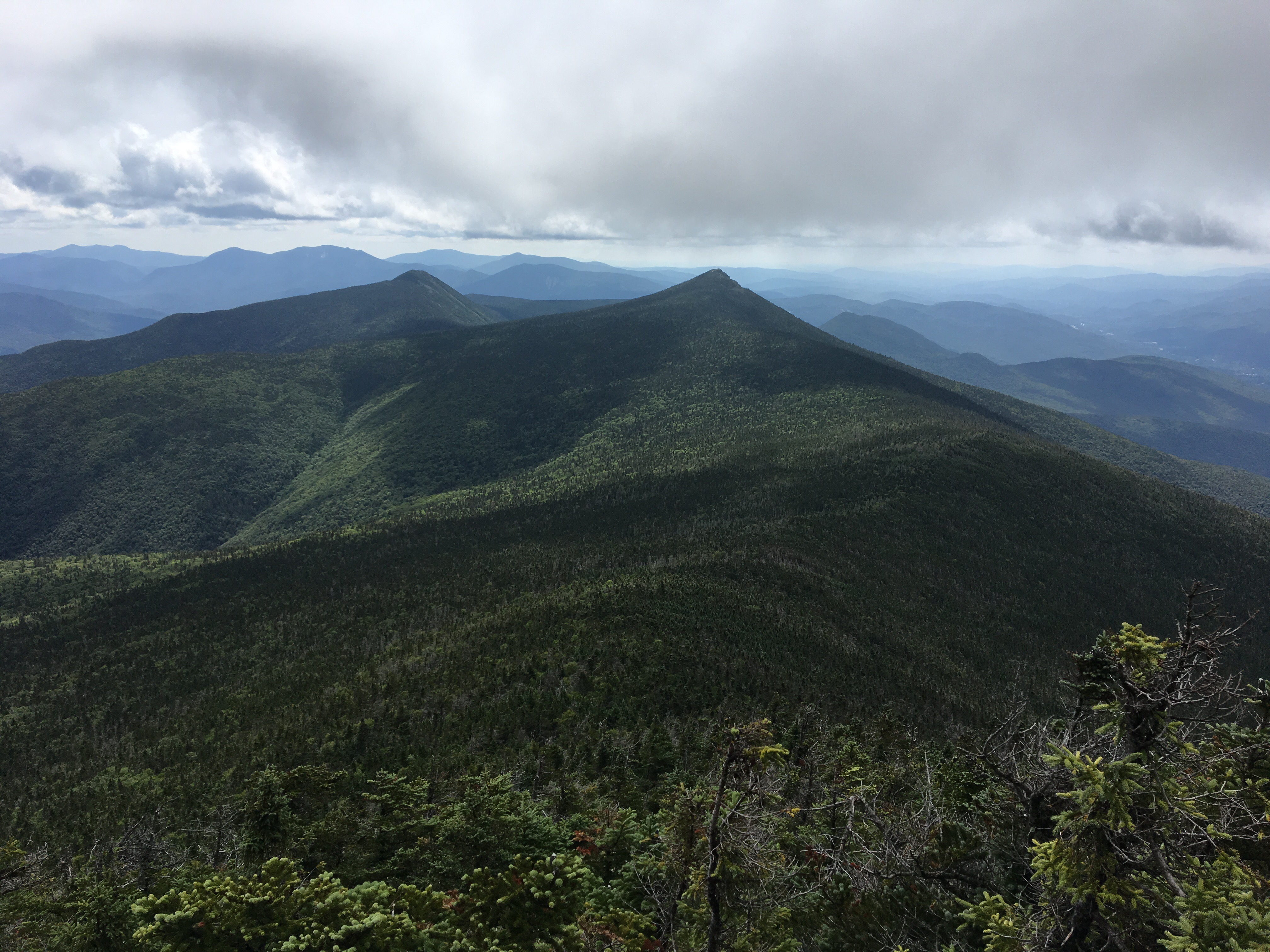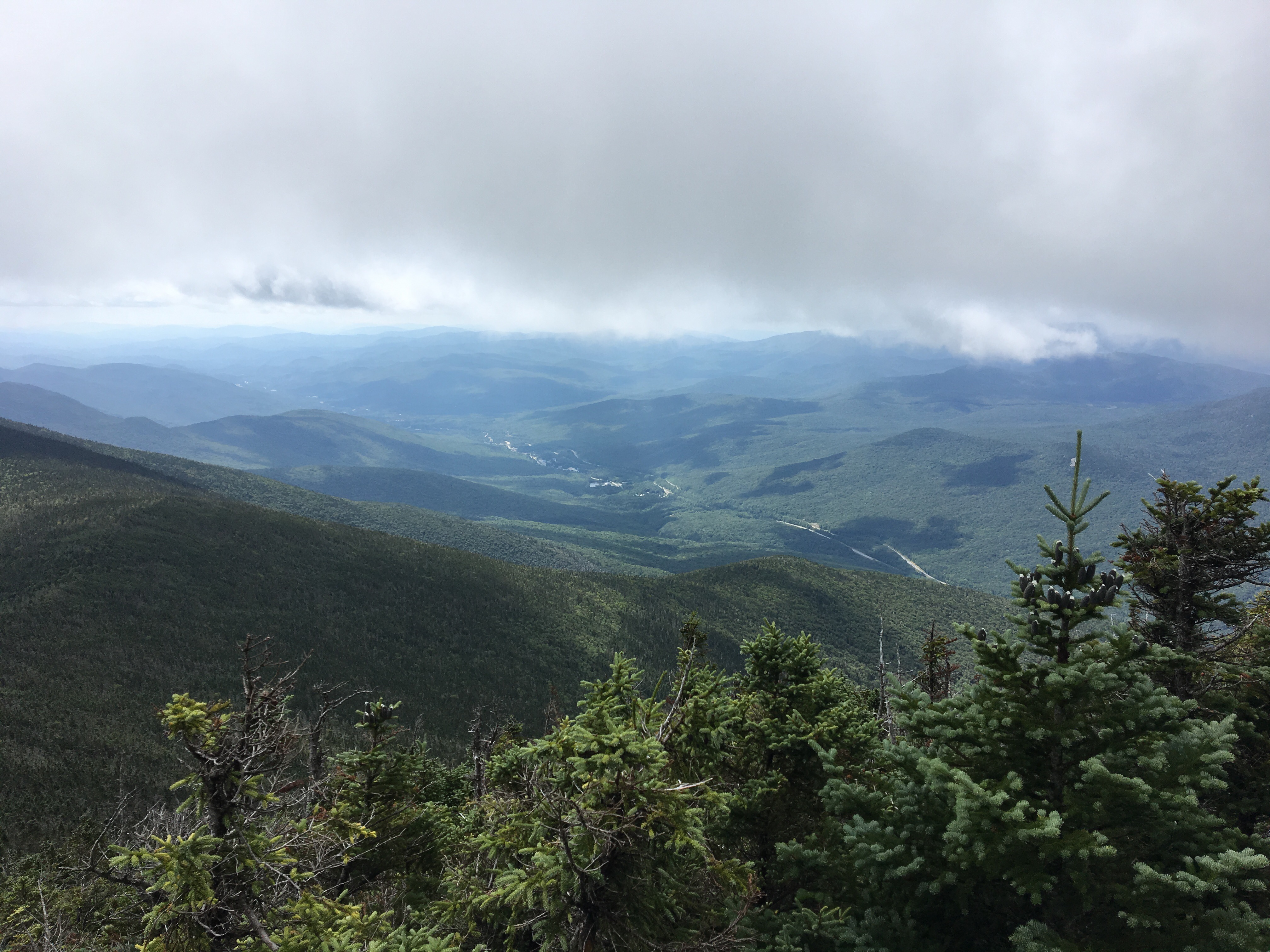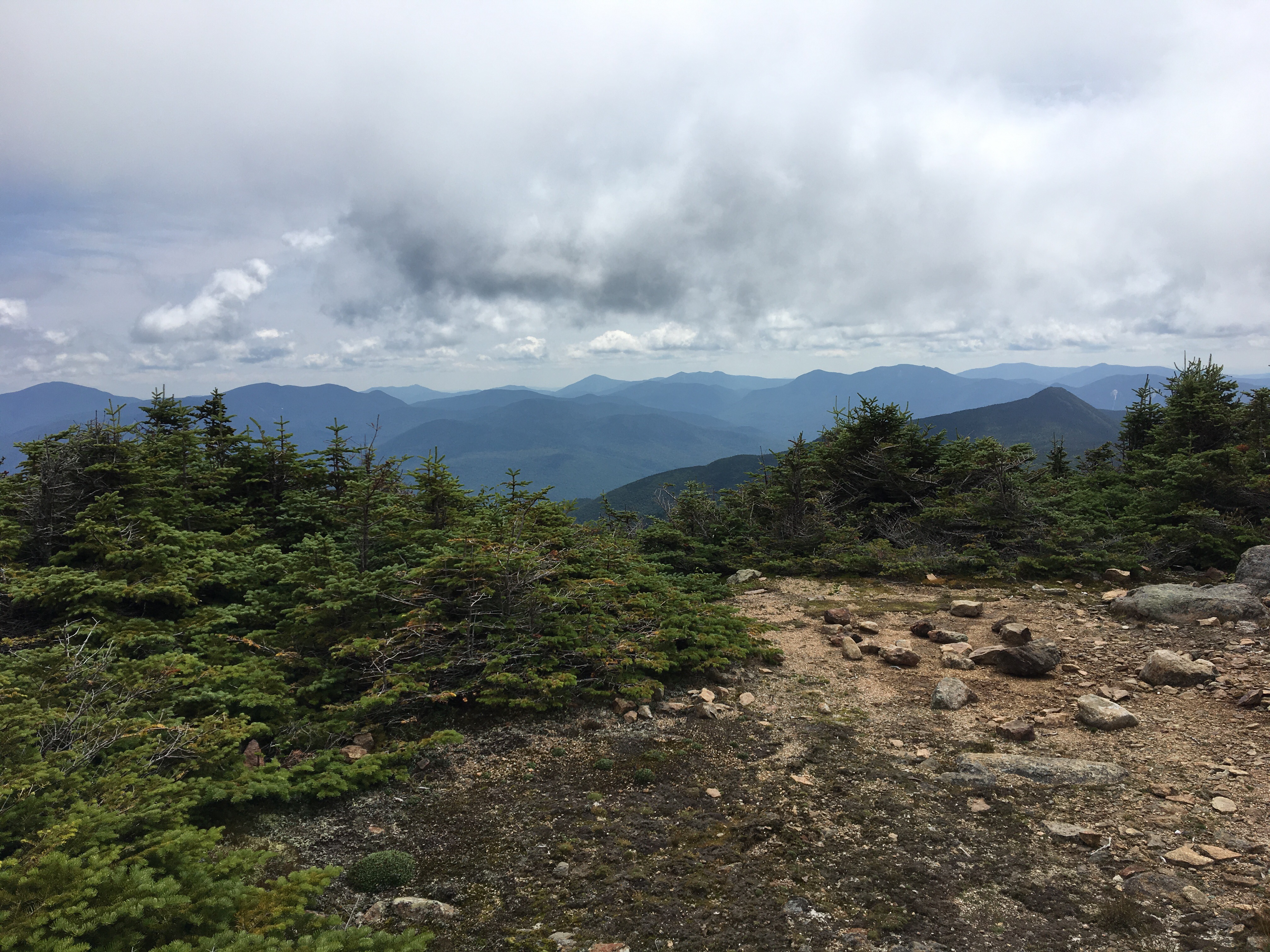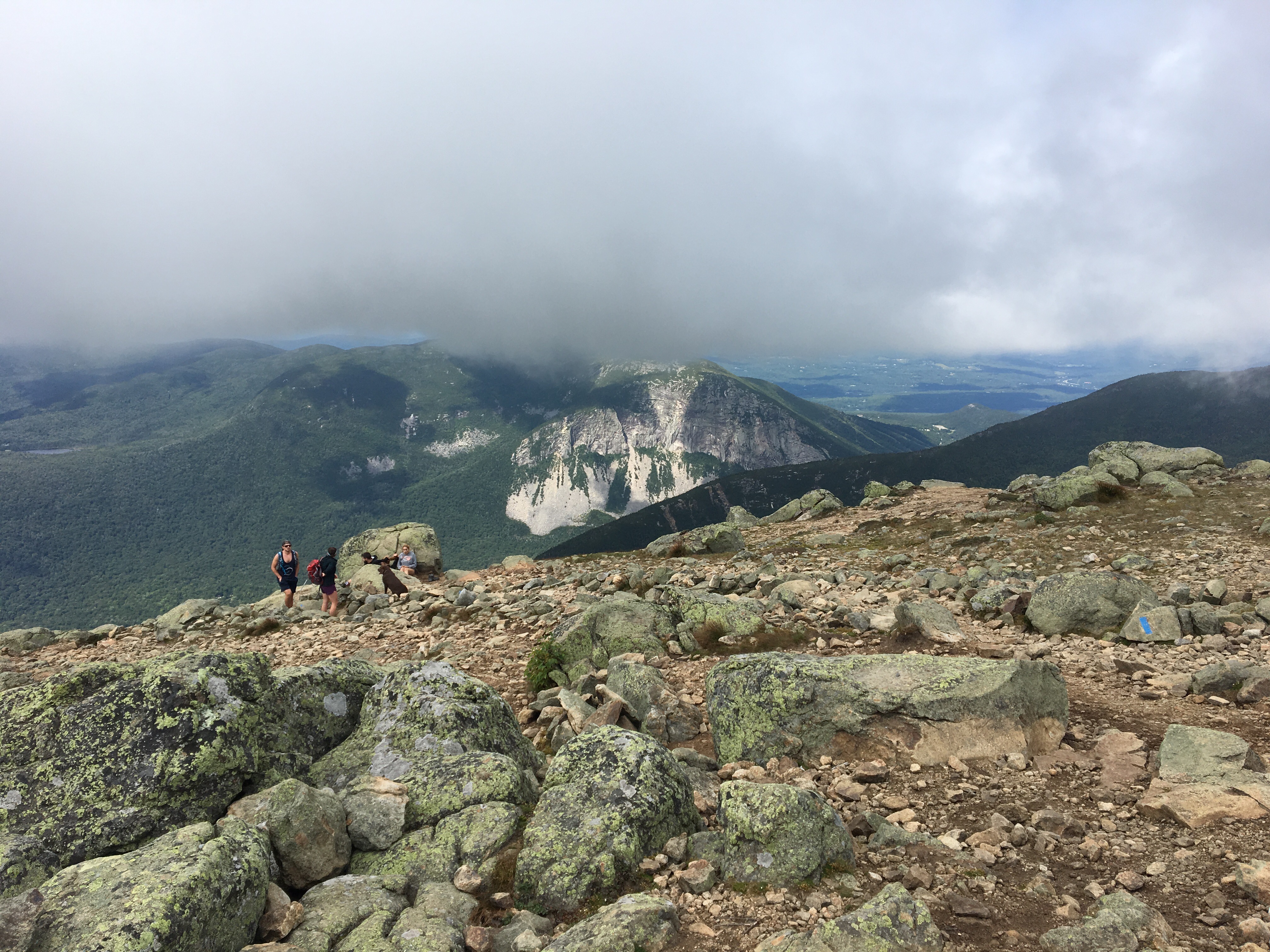 I ended up spending most of the day hiking with Avalanche, since our paces are similar. The ridge trail climbs through the woods, eventually going above treeline, summiting Little Haystack (4780′), then staying out in the open and climbing Lincoln (5089′), and ultimately Lafayette (5260′). The weather was clearing as we climbed, first hiking in the clouds as we walked through the krumholtz, then clearing on Little Haystack, and then on the subsequent peaks as we approached them. The view was outstanding. And that’s when my phone memory ran out. I did take some shots and video with the Mokacam, but it was frustrating to lose the iPhone camera.