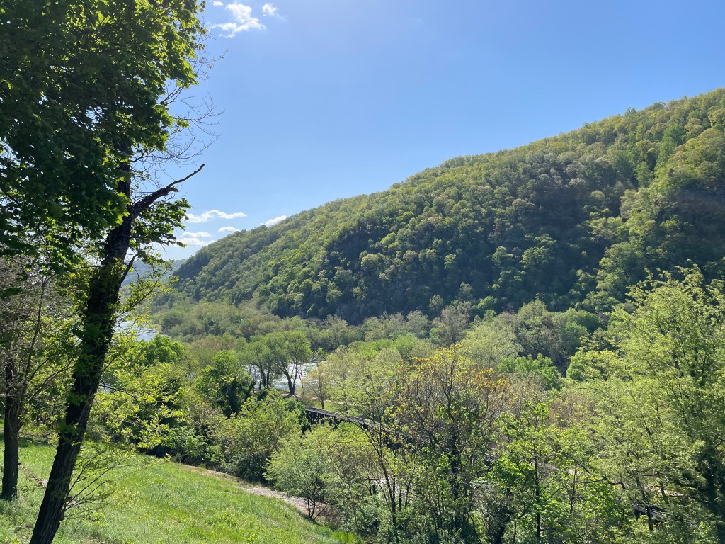 The first mile or so crosses a steep slope above the Shenandoah River, with a precipitous drop to the left. Even with the daypack, I struggled at first with vertigo, but soon got the feel of the trail. Crossing the road bridge over the river, the wind tried to throw my hat into the water.