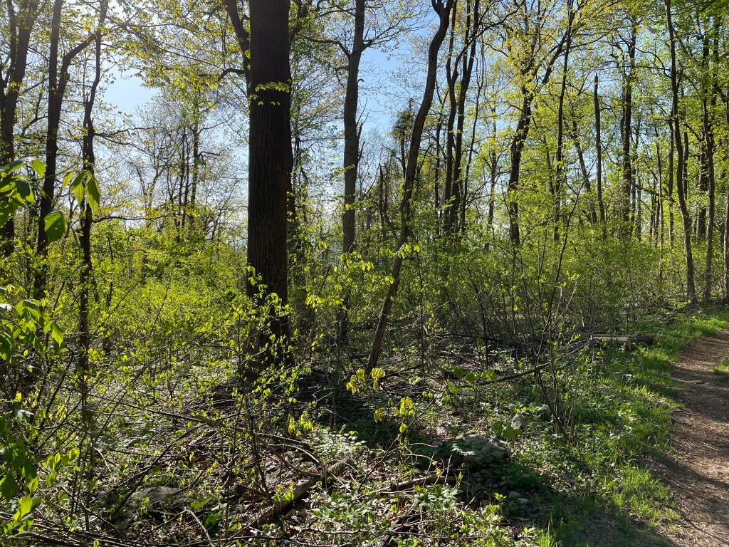 Being out early on the trail has it’s benefits and drawbacks, and I was thinking of Jay (from the YouTube channel “Jay Wanders Out.” https://youtube.com/@JayWandersOut) and his complaints about the spider webs the first hiker of the morning continues to walk into. I walk along with my head tipped forward to catch them on my hat. But that obscures my view forward; with that and eye aimed inward, I ran full bore with my forehead into a branch or fallen tree (I’m not sure which). It actually made my vision blur and darken, and I felt myself falling backwards, and barely caught myself. Dazed, I stopped at the next shelter to sit for a bit, grab a snack and refill my water. It was really cold sitting there, which kept the rest stop relatively brief.