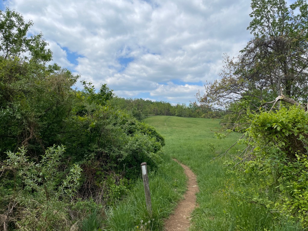 Meadow walking is a beautiful change of pace, but it is also a little like walking on a bobsled run. Other’s feet have worn a U-shaped rut that makes foot placement a little tricky.